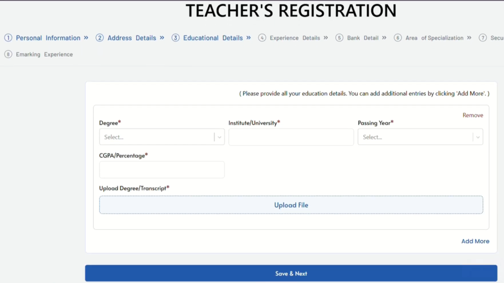 - Step3: Fill in your educational details. Select your Degree level such as BS, Masters or Phd/ Your educational Institute, Passing Year, CGPA or percentage. You also need to upload your degree or transcript here. You can see in bottom right an add more button, By clicking it you can add your all educational level degrees one by obe such first Masters then BS.