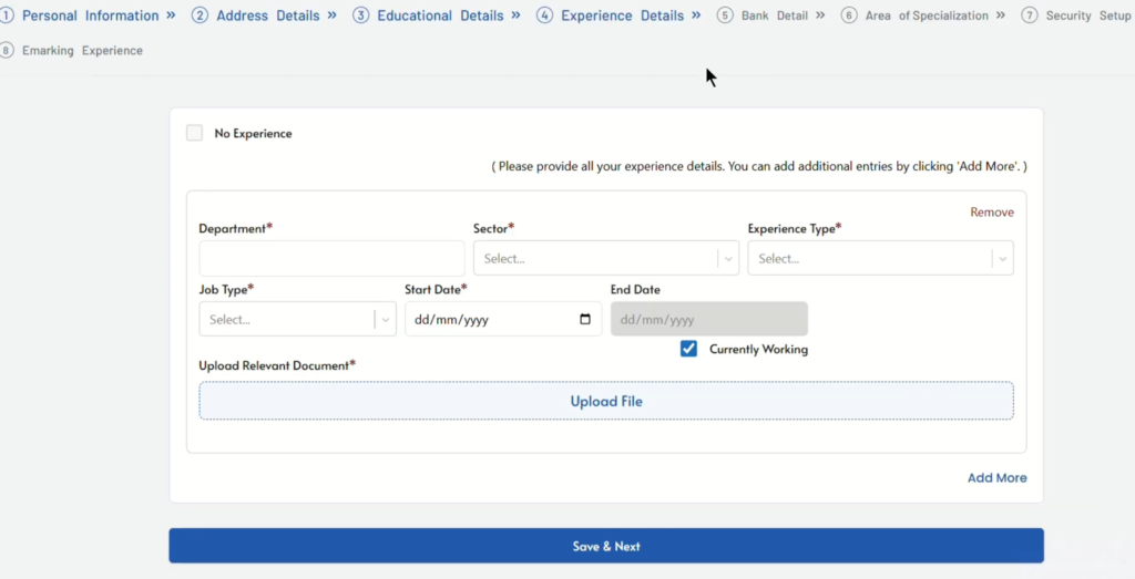 - Step 4: Add here your all experience detail till today. If you do not have experience simply check the no experience box in top left corner.