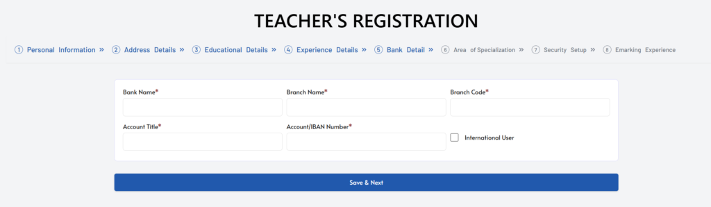- Step 5: For Salary fro your Paper Chceking Provide your Bank Name. Bank Branch, Branch Code, Account Title. Account Number or IBAN. Leave theinetrnation user box uncheck and Click Save and Next.
