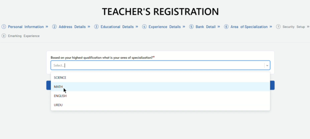 - Step 6: Choose your Area of Specialization out of 4 subjects ( Science, Math, English, Urdu)